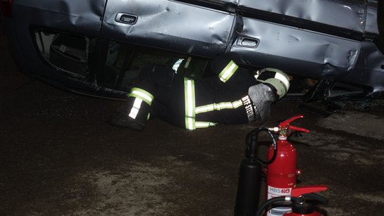 Auf einem Betriebsgelände in Baustellennähe wurde ein schwerer Verkehrsunfall mit drei PKW und mehreren schwer eingeklemmten Personen nachgestellt.