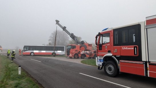 Aufgrund des dichten Nebels hatte der Fahrer eines Linienbusses die Fahrbahn verfehlt und ist auf einem Verkehrsschild, in der angrenzenden Wiese stecken geblieben. Zur Bergung des Buses wurde die Firma Hummer GmbH hinzugezogen.
