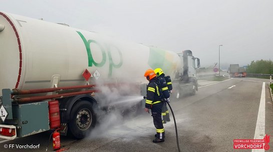 Der Fahrer eines mit Benzin und Diesel beladenem Tanklastwagen bemerkte während der Fahrt, dass sein Auflieger zu rauchen begann. Der Lenker alarmierte umgehend die Feuerwehr und blieb im Bereich des Parkplatzes der Raststation Lindach stehen. Der rauchende Bereich des LKW Aufliegers wurde anschließend von der Feuerwehr gekühlt und mit der Wärmebildkamera kontrolliert.