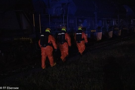 Um 23:35 Uhr wurde das Gleis Strom los geschalten und der Erkundungstrupp in Schutzstufe 2 konnte mit dem eruieren des Beschädigten Wagons beginnen. Der Wagon wurde begutachtet und das darin Befindliche Gefahrengut, wobei es sich um Chlor Wasserstoffsärure (Salzsäure) handelte, ermittelt.